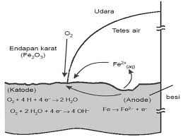 Daerah permukaan besi dapat bertindak sebagai Anoda, diamna pada Anoda ini terjadi peristiwa oksidasi, dan elektro yang dilepaskan mereduksi oksigen di udara menjadi air pada katoda